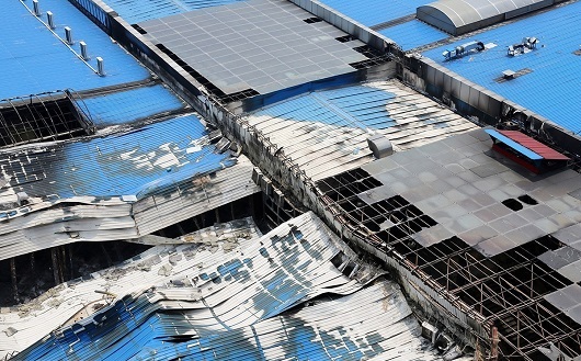 為什們會這么快就坍塌呢?我們做個簡單分析:事發(fā)現(xiàn)場滿目瘡痍,猶如世界末日,從現(xiàn)場我們可以看出,該建筑是由鋼結(jié)構(gòu)為主體加上彩鋼夾芯板作為圍護建成的一座鋼結(jié)構(gòu)商城,是一個典型的鋼結(jié)構(gòu)建筑。鋼結(jié)構(gòu)做為一種綠色建筑的代表,不耐火是它的劣勢,也是致命傷,從此次事故現(xiàn)場我們能看到,由于鋼結(jié)構(gòu)柱子受熱已經(jīng)變形扭曲剛度逐漸下降,慢慢失去了承重的能力,因而造成了商場建筑的坍塌。我們還可以看到該建筑的屋頂采用的是巖棉夾芯板,而巖棉的防火性能比較好,基本不燃,所以,主要的火源是商場的貨物。大火炙烤著底部的鋼結(jié)構(gòu)柱子,當(dāng)溫度越高,鋼構(gòu)件的強度就越弱,以至于承受不起屋頂?shù)闹貕憾斐闪丝逅?/p>